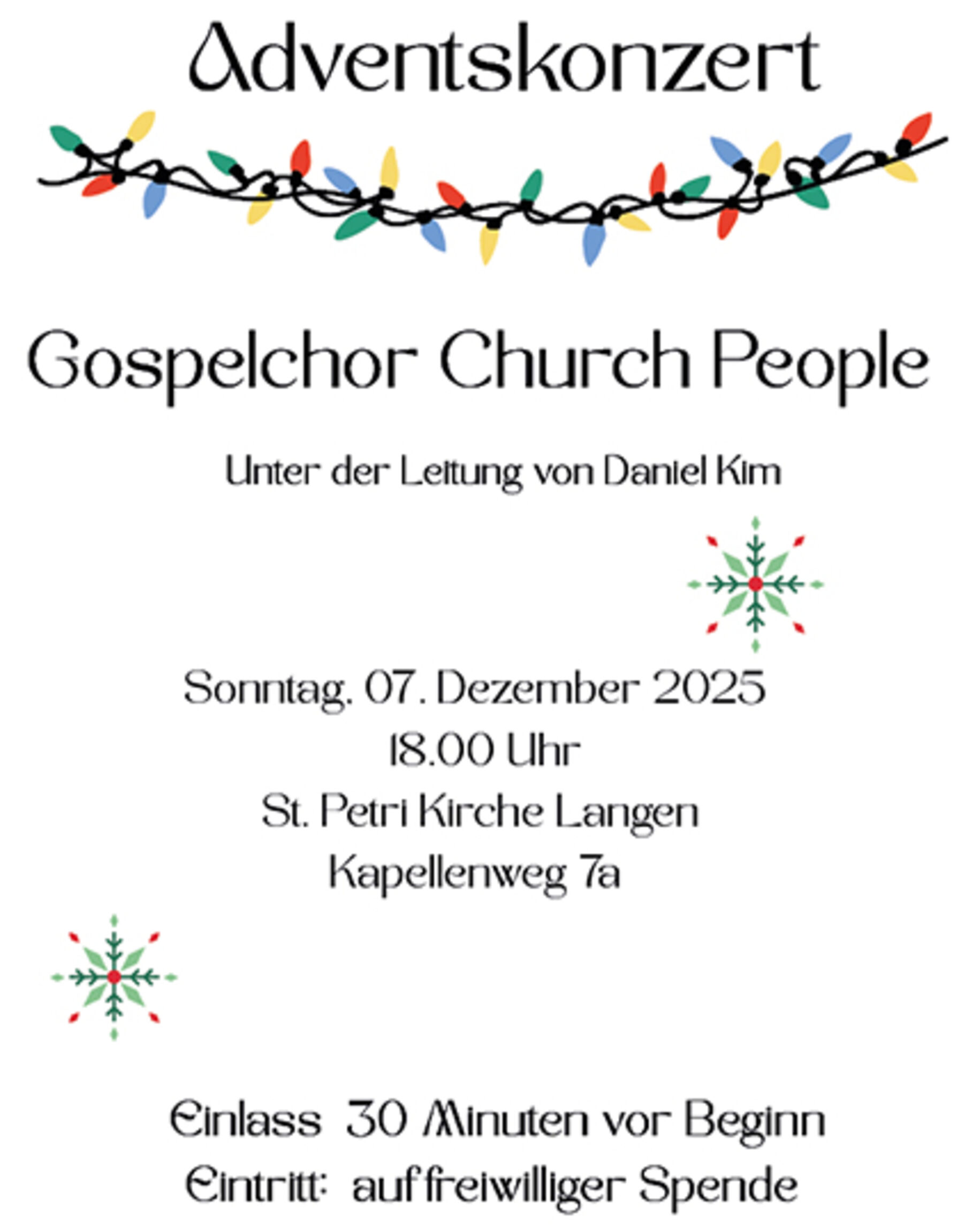Auch in diesem Jahr will uns der Gospelchor ChurchPeople unter der Leitung von Daniel Kim mit bekannten und neuen Gospel- Songs auf Weihnachten einstimmen: